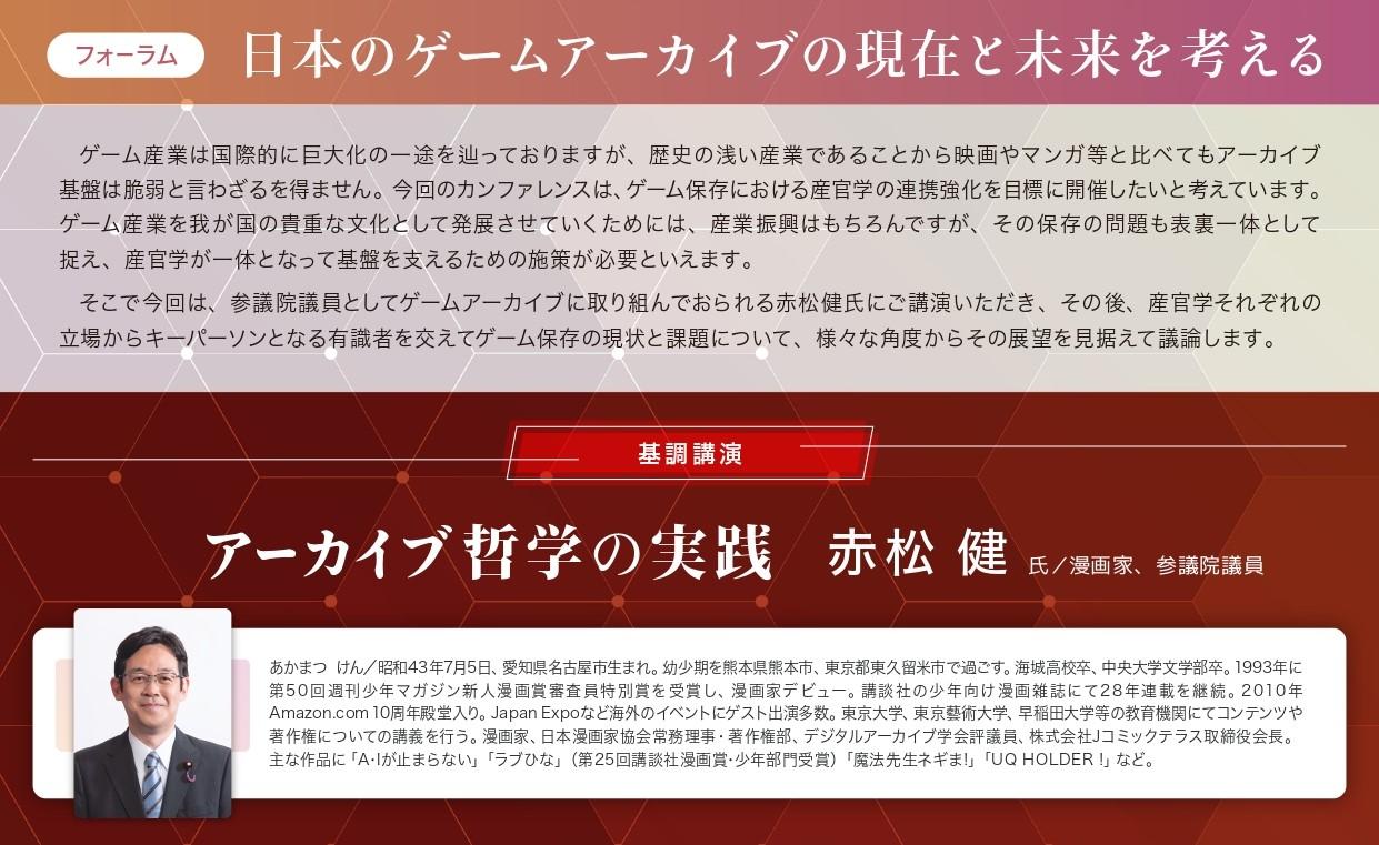 ゲーム保存の重要性と産官学連携の強化を目的とした今回のフォーラムは、前半では、歴史アーカイブ研究センター所長 細井浩一による趣旨説明の後、参議院議員の赤松健氏による「アーカイブ哲学の実践」と題した基調講演が行われました。